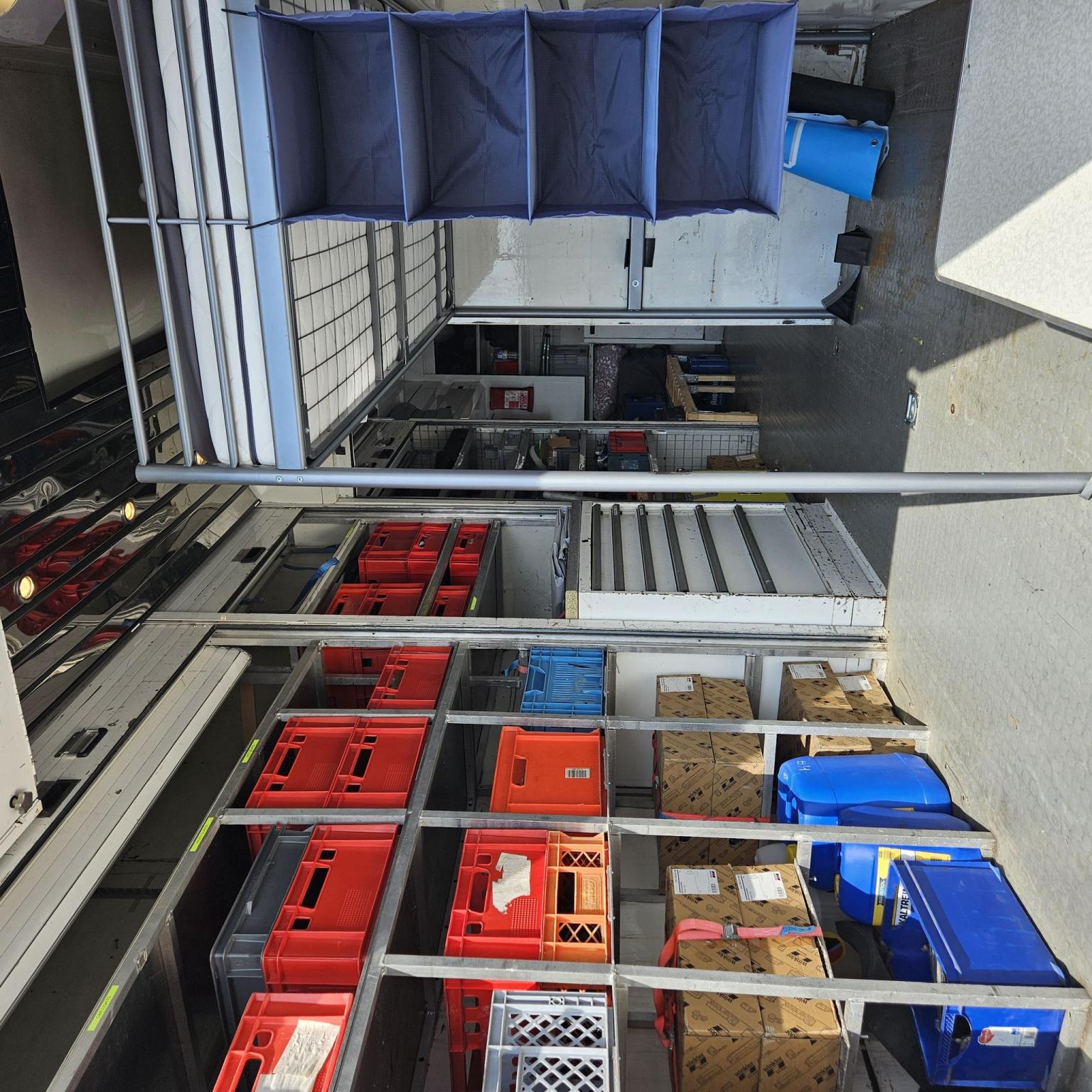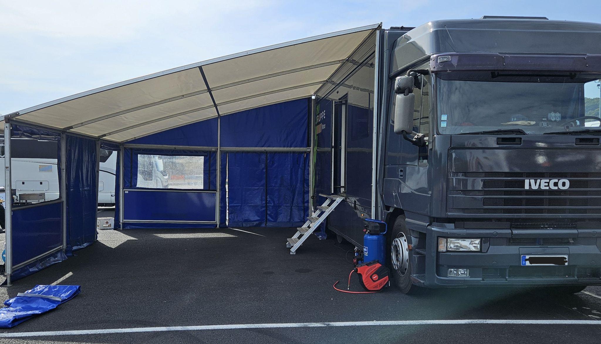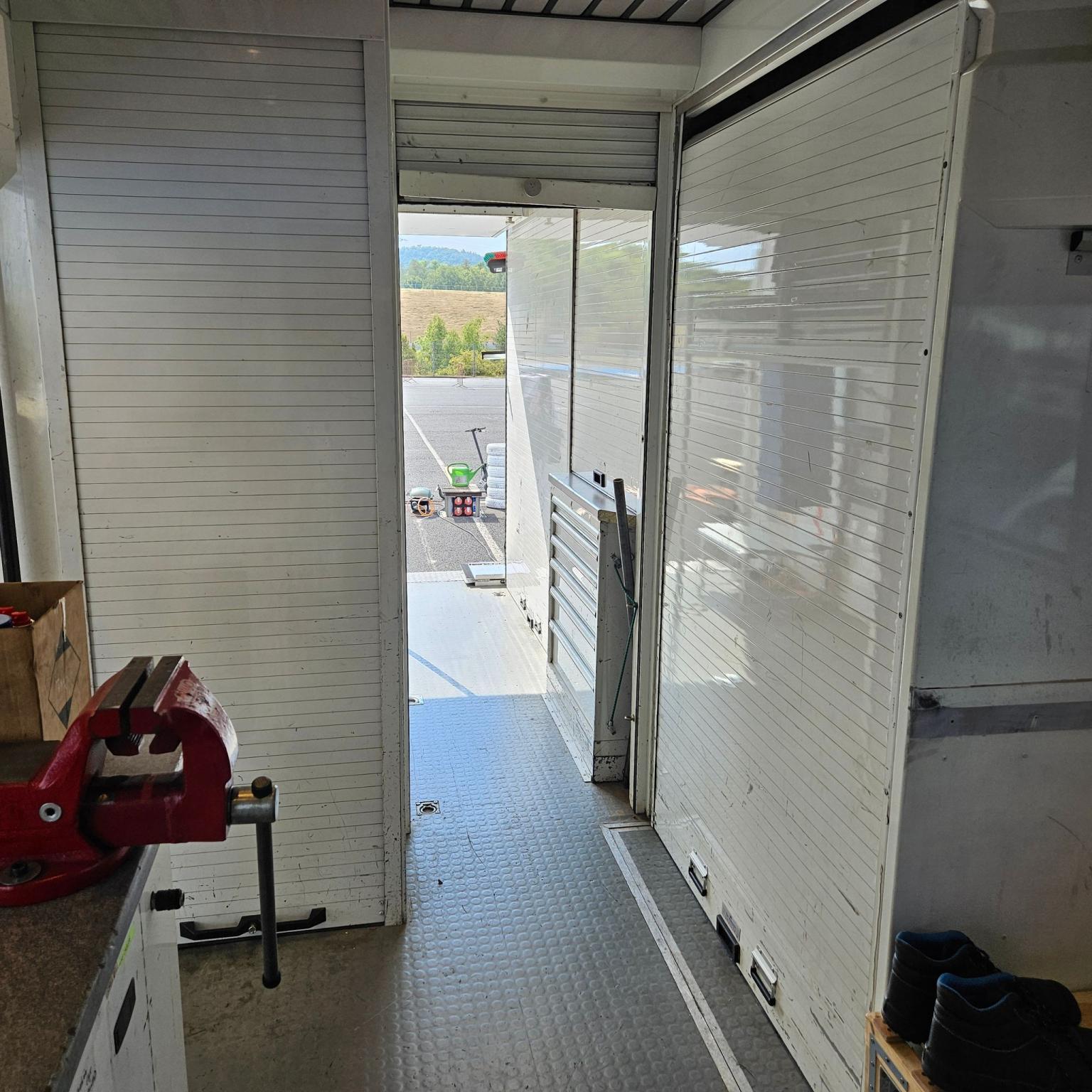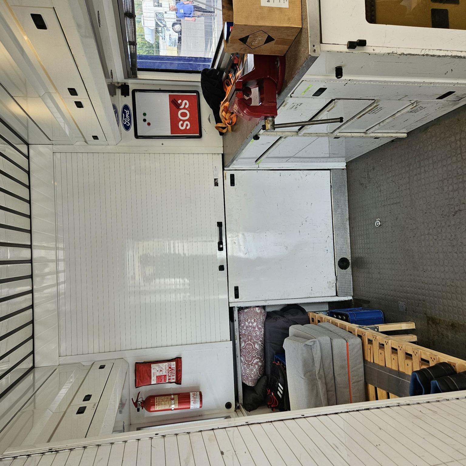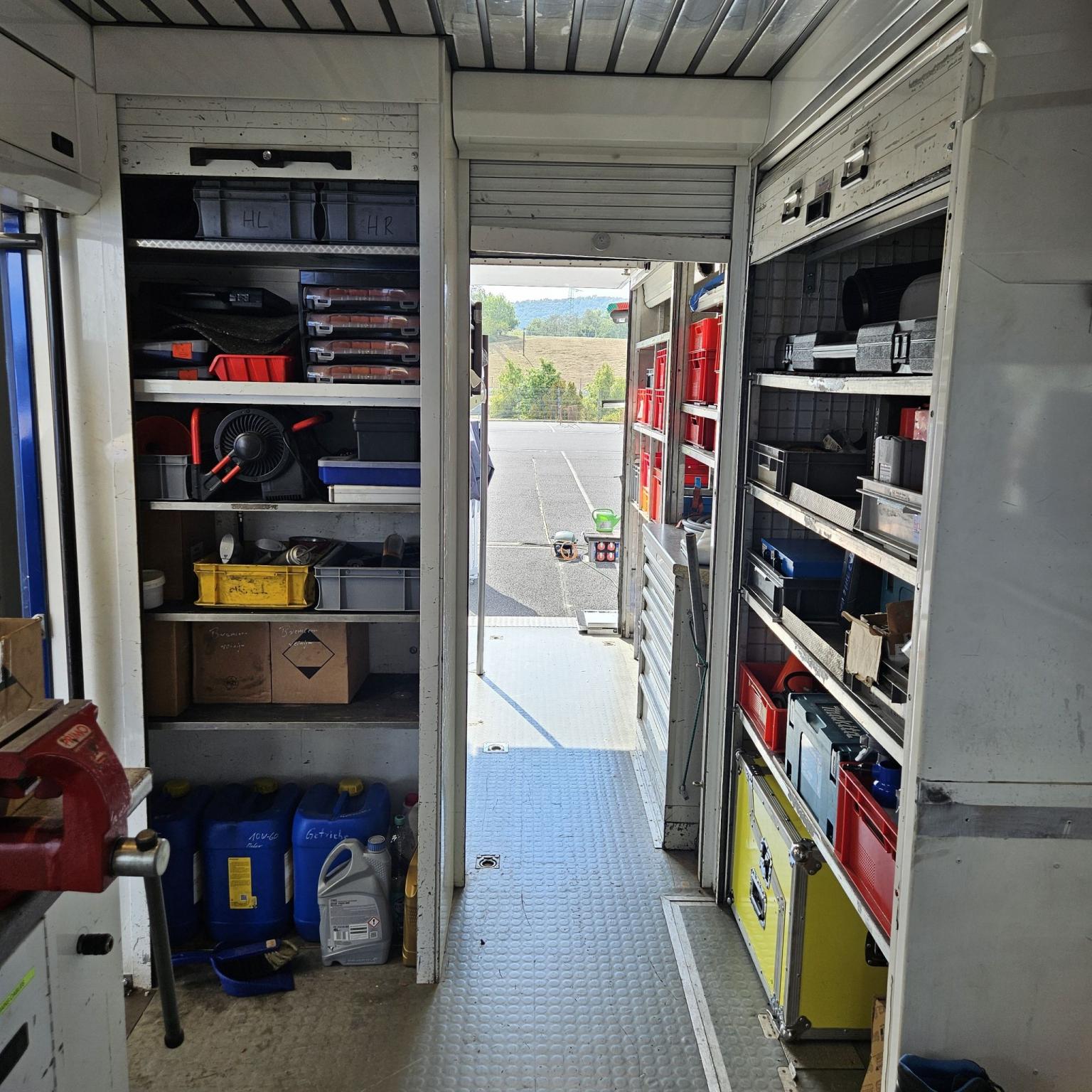 Závodní/servisní transportér, ex-Ford M-Sport, tovární výbava (žádná vlastní přestavba), zvedací plošina, četné police, pracovní stůl, svěrák, externí napájení, kompletní pojistková skříň včetně řídicí jednotky, velký boční stan (7,80 x 5,50), stan lze prodloužit kolem zadní části vozidla, přídavná markýza, velký vnější úložný prostor, vysouvací postel v přední části, vestavěná postel v zadní části, samostatné pomocné topení v karoserii